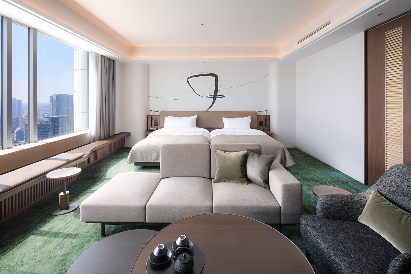 Tokyo Retreatを叶える最上級のおもてなし空間で、東京ドームホテルを象徴するフロアに位置するスイートルーム。木の質感を活かしたAuthentic Naturalの落ち着いたデザインで寛ぎのひと時を演出。