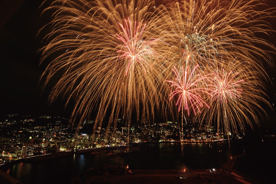 相模灘・熱海市街が一望できる客室からは、熱海海上花火大会の大迫力の花火を間近でお楽しみいただけます。プライベート空間で目の前に広がる花火を見渡す贅沢なひと時を。