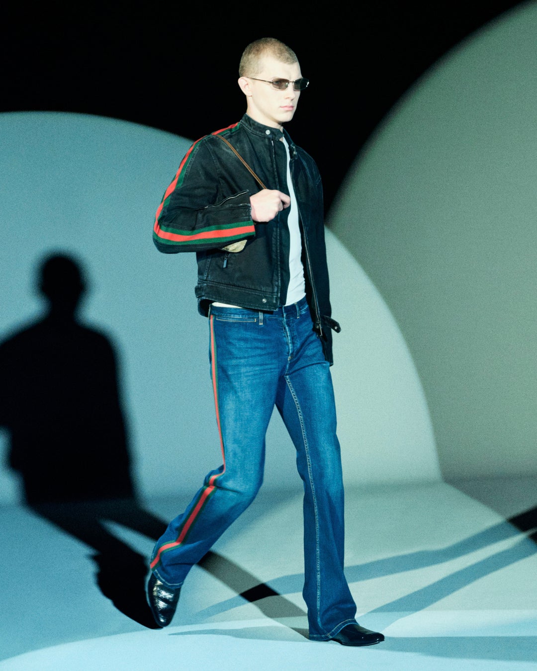 1970年代や1990年代のグッチを象徴するスタイルを再解釈し、ウェブ ストライプをあしらったレーサージャケットや、シグネチャーのダブルG ハードウェアを薄くアレンジしたバックル付きのベルト、全身レザーやスエードでまとめたルック、アーカイブのシルクスカーフを思わせるエクエストリアン(乗馬)プリントのシルクで仕立てたセットアップなども登場します。