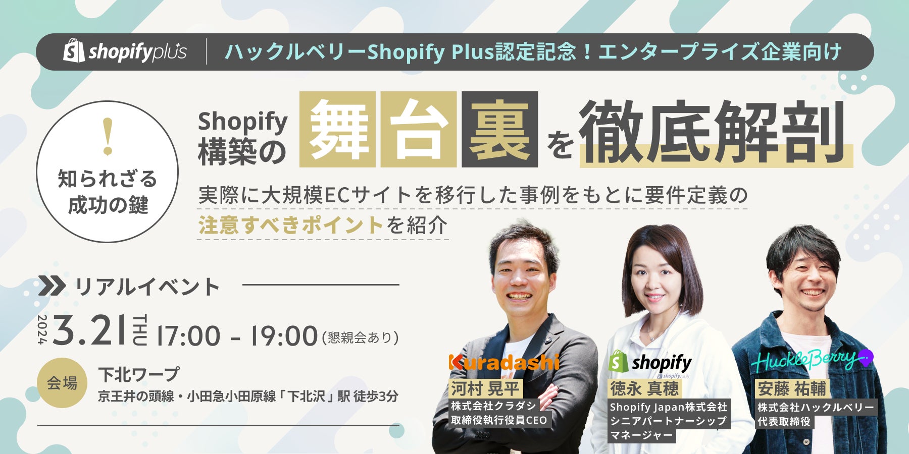 18,000社におよぶShopifyマーチャントさまを支援してきたハックルベリーならではの、Shopifyを活用することのメリットや、効果的かつ効率的にストア構築を行うための手法を公開します。また、実際にShopifyを活用して急成長を遂げたクラダシ様をお招きし、Shopifyへの移行事例をパネルディスカッション形式にてうかがいます。