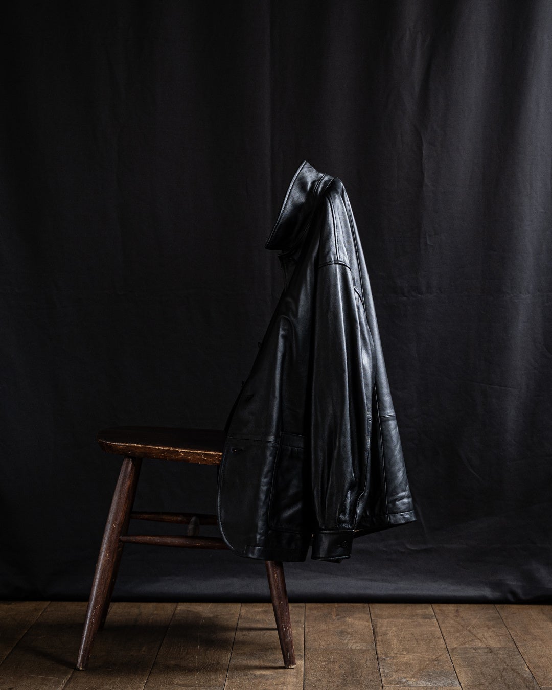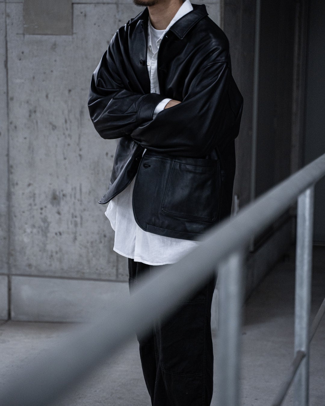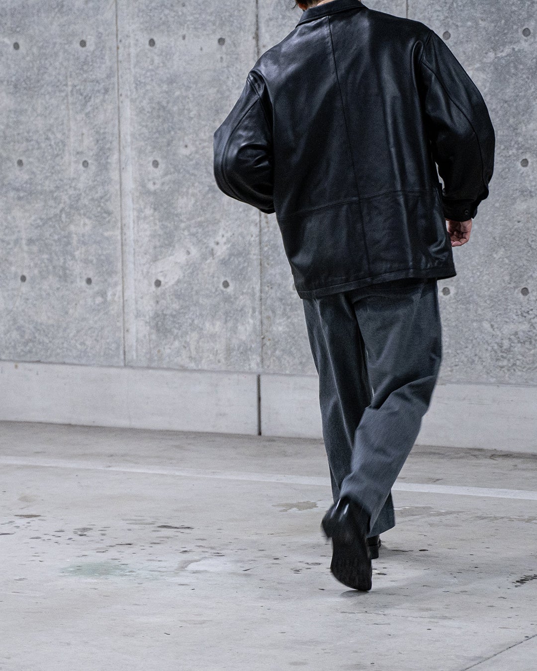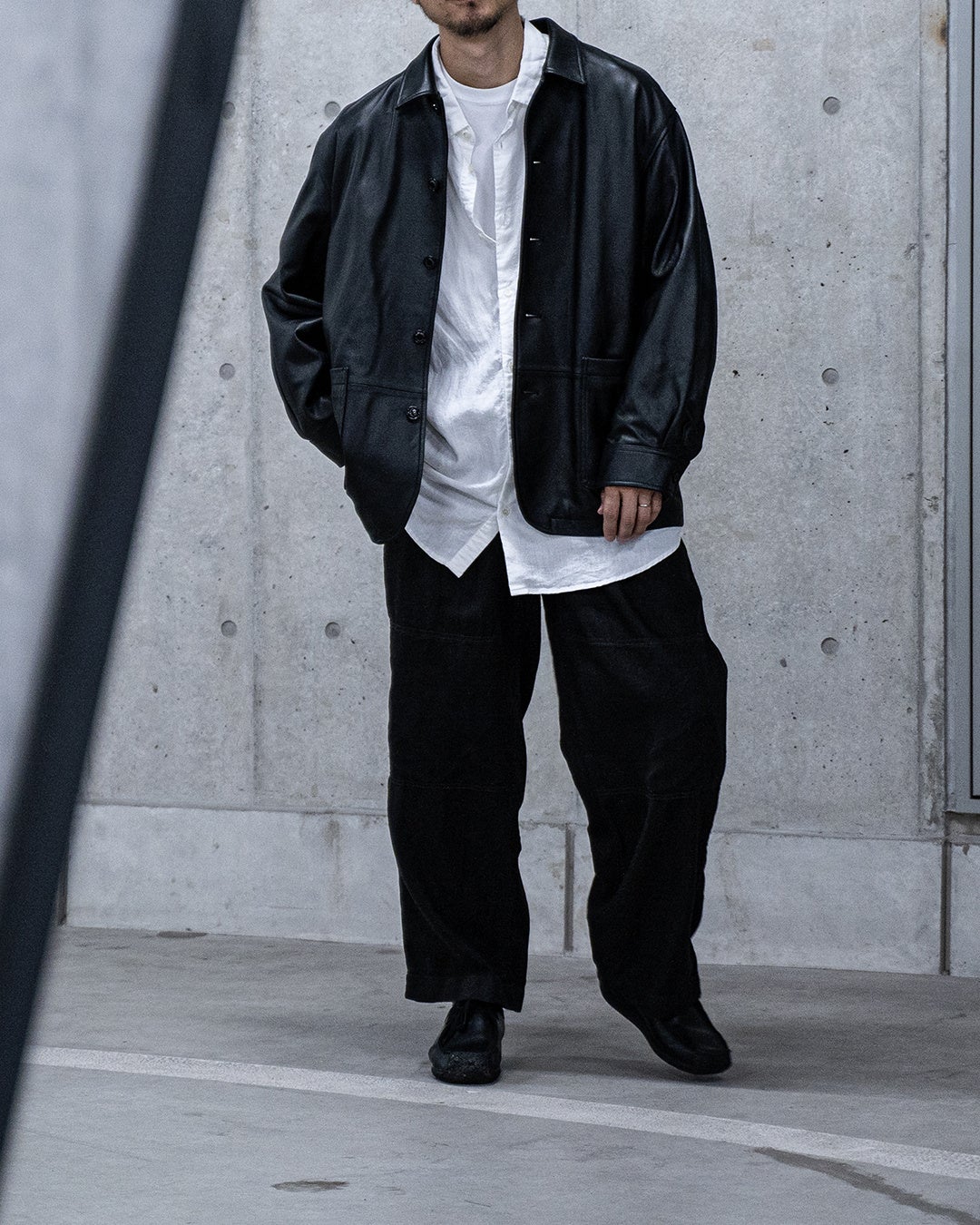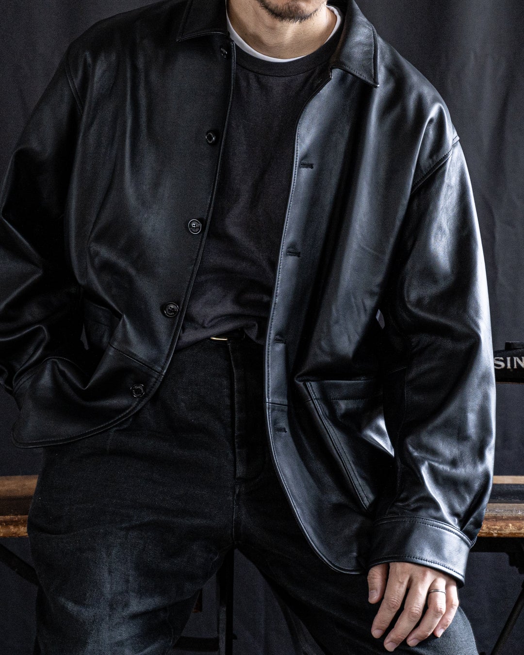 昨年に続き今季も、素材には柔らかく薄い0.7mm厚のラムレザーを用いたことで、たっぷりとしたシルエットと程良いドレープ、着用時には適度なシワ畝のあるレザージャケットをご用意しました。