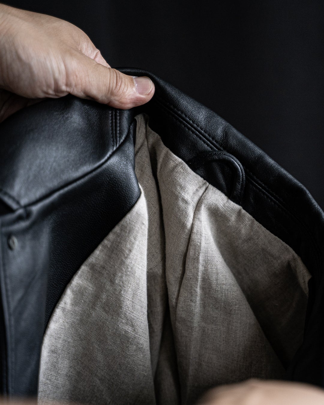 リネンの服をご提案する中で、レザーの上着は、その無骨さや硬さが先立ってしまい、柔らかいリネンとは馴染み難いものという課題がありました。リネンの服をご提案するCONFECTとして、ゆったりと纏うリネンの服と近しい気分で着ることができるレザージャケットは、長年探求してきたものです。