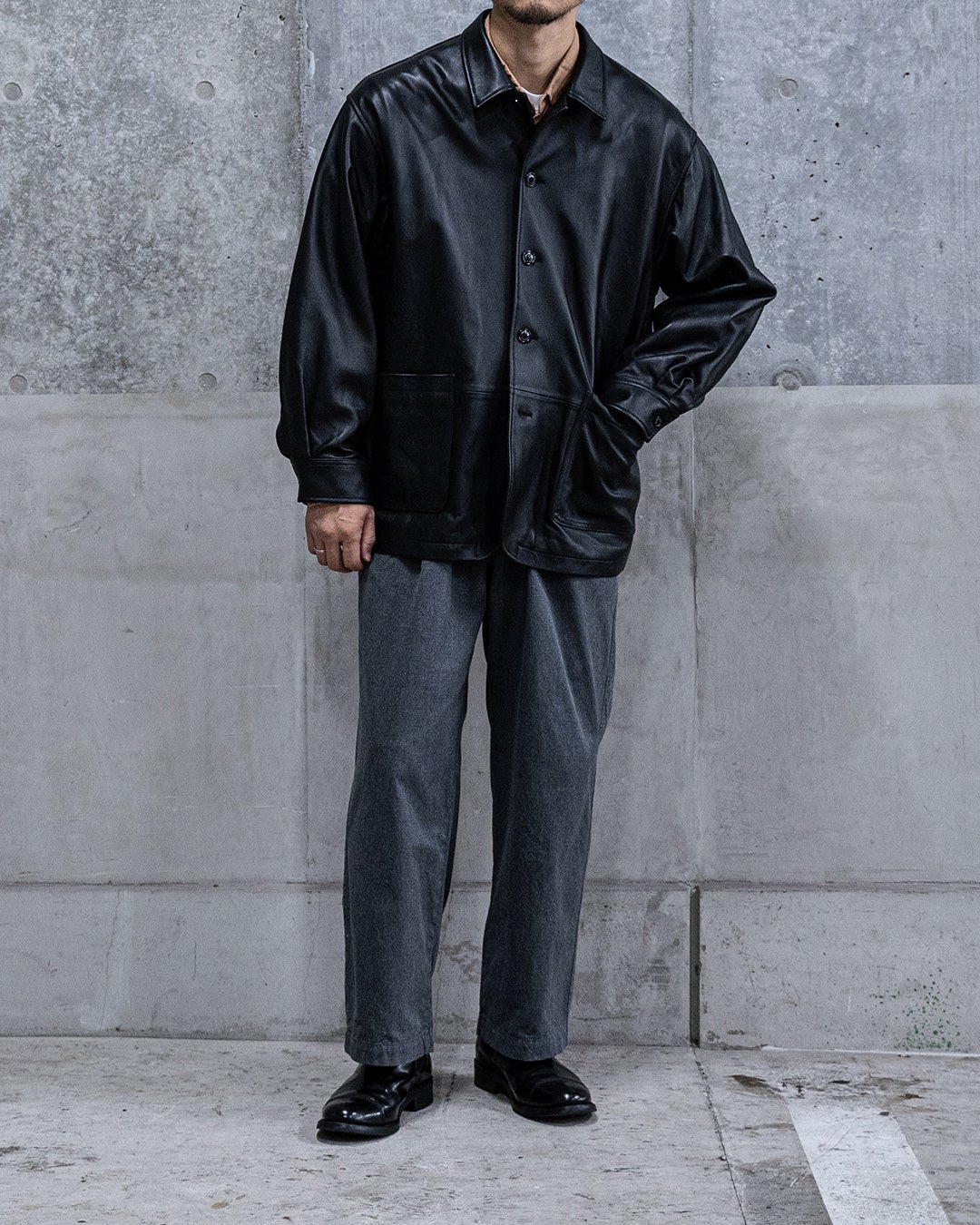 本来、手袋(グローブ)に用いられることが多い0.7mm厚のラムレザー。体を大きく覆う、ゆったりとしたシルエットのジャケットに落とし込むことで、その薄さが活かされ、肌理の細かい革質が、波打つレザーの流れとともに上品に現れます。