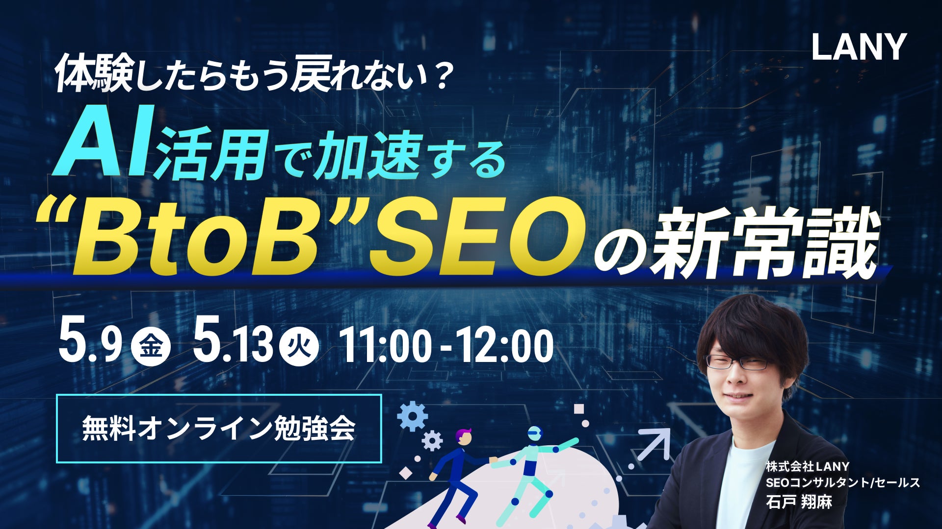 デジタルマーケティング支援を行う株式会社LANY(東京都渋谷区、代表取締役社長:竹内渓太)は、【無料勉強会】体験したらもう戻れない?AI活用で加速するBtoB SEOの新常識を5/9(金)・5/13(火)に開催いたします。