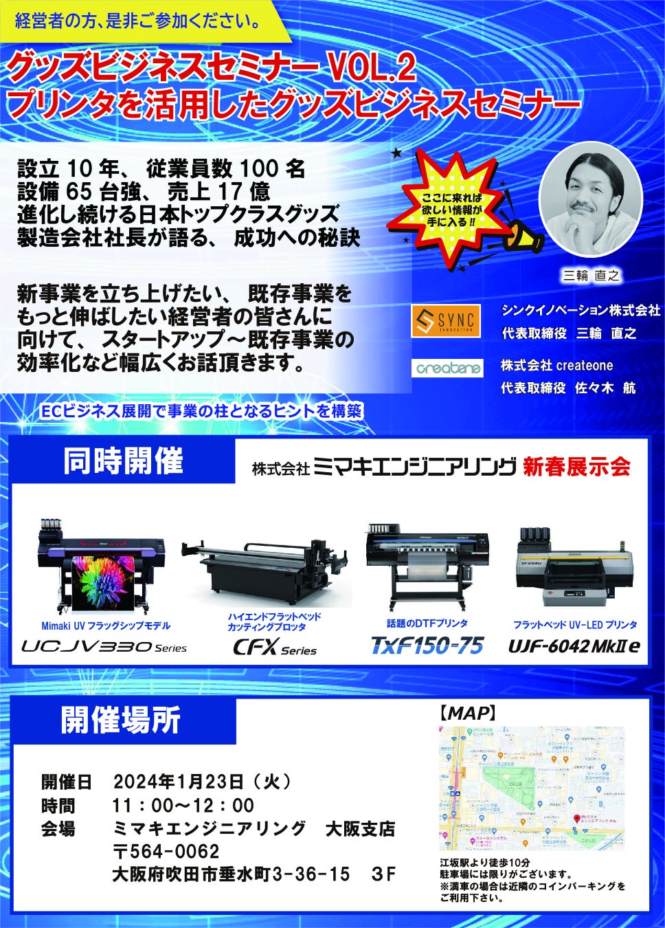 この度弊社は、2024年1月23日(火)にミマキエンジニアリング大阪支店の新春展示会にて”グッズビジネスセミナー”を開催致します。
