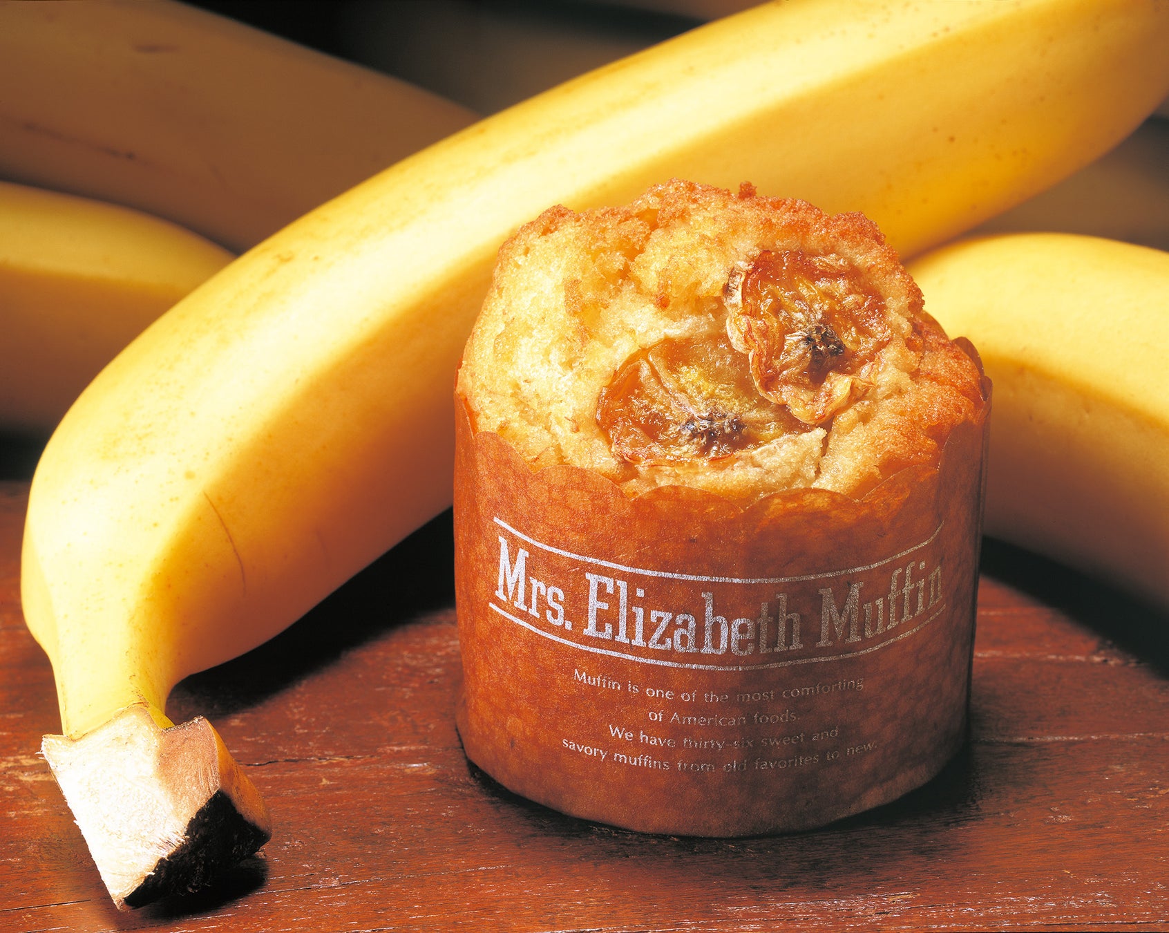 完熟したフレッシュバナナを生地に加えて焼き上げました。コクのある甘みと香りはフレッシュならでは。オープン当時からミセスエリザベスマフィンを代表する商品です。