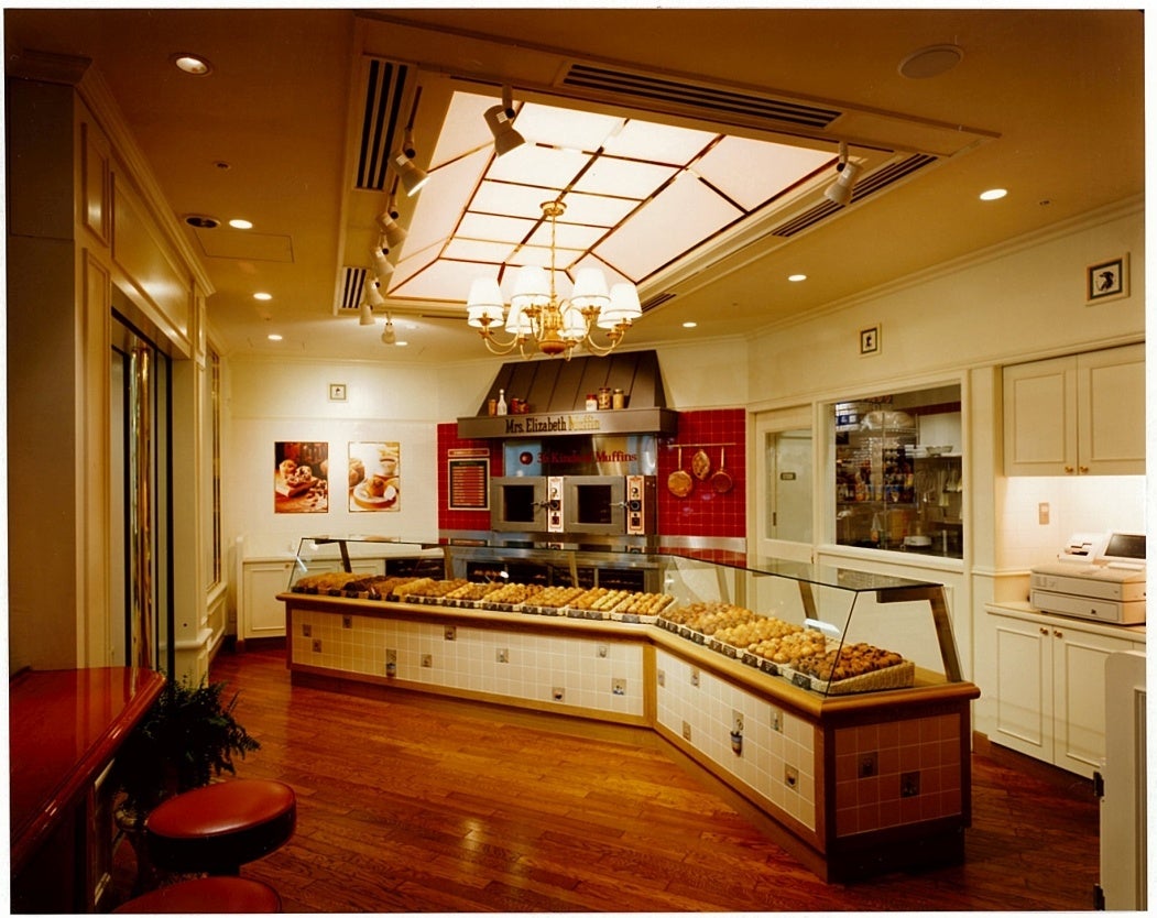 「ミセスエリザベスマフィン」は、アメリカの雑誌編集者エリザベス・アルストンさんが書いた焼菓子の本からインスピレーションを受けて、日本で美味しいアメリカンマフィンの専門店を作りたいという想いから誕生しました。創業に向けて、お店の雰囲気やサービスなどのコンセプトは「エリザベスさんってどんな人でどんな家に住んでいるのかしら」と具体的なイメージをふくらませながら作っていきました。特徴的な店舗デザインは、エリザベスさんご一家のダイニングルームや応接間をイメージしています。