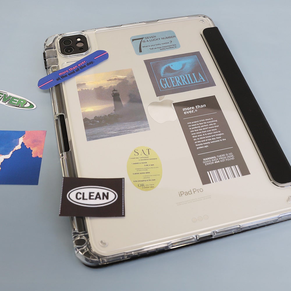 背面がクリアだからiPad本体のカラーをそのままに、シールなどを入れて個性を出すのも○