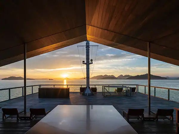 建築家・堀部安嗣氏のデザインによる太陽や海の色を映し出すシルバー色の船体の中には、わずか17室の全室テラス付きの客室のほか、「お好きなものを、お好きなだけ」をコンセプトとするダイニング、海の見える鮨カウンター、障子越しに柔らかい光が届くラウンジ、檜の浴槽とサウナのある浴場など、思いのままにお過ごしいただける空間が広がっています。