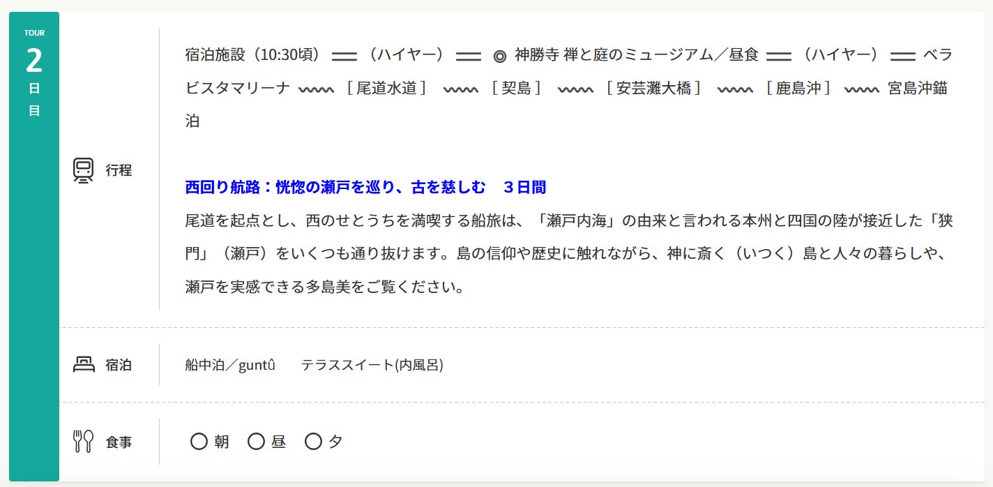 季節ごとに移ろいゆく瀬戸内海の風景と一体になり、「ただ、過ぎゆく時を愉しむ」、そんな穏やかでのんびりとした旅をお楽しみください。