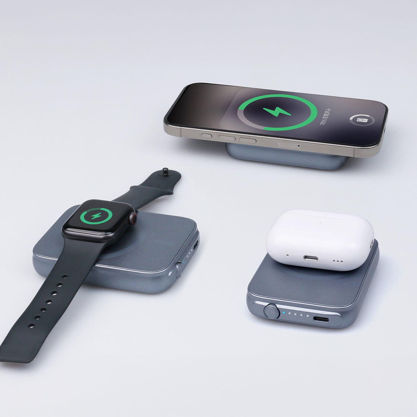 同製品は、iPhone、Apple Watch、AirPods、Qiデバイスなどのワイヤレス充電に対応するマグネット式モバイルバッテリーです。軽量・コンパクトで持ち運びやすく、ワイヤレスでは最大15W・有線では最大20Wのパワフルな充電が可能です。