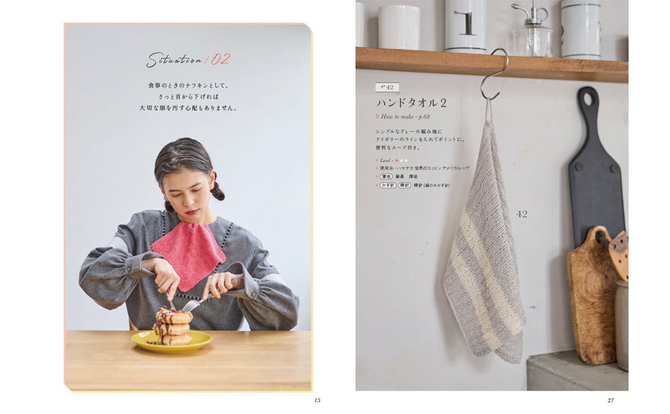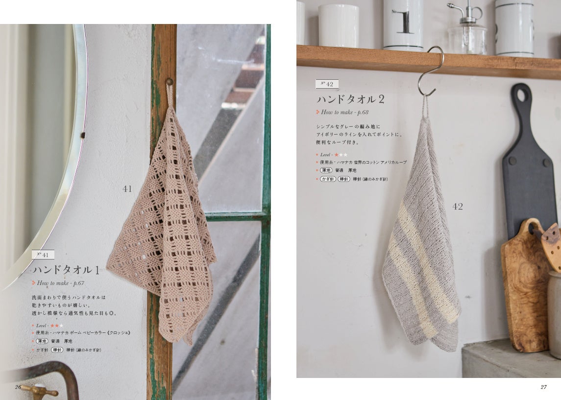 編み方によって違った触り心地になるのがニッタオルの面白み。棒針編みは柔らかめ、かぎ針はしっかりとした触り心地に仕上がります。それぞれの作品には使用した糸や針はもちろん、出来上がりの編み地の厚さや難易度も表示しています。作るときの参考にしてください。