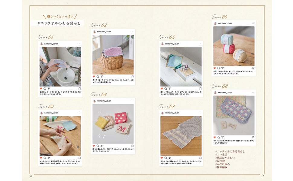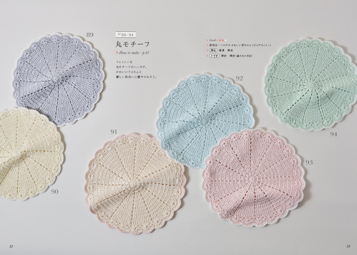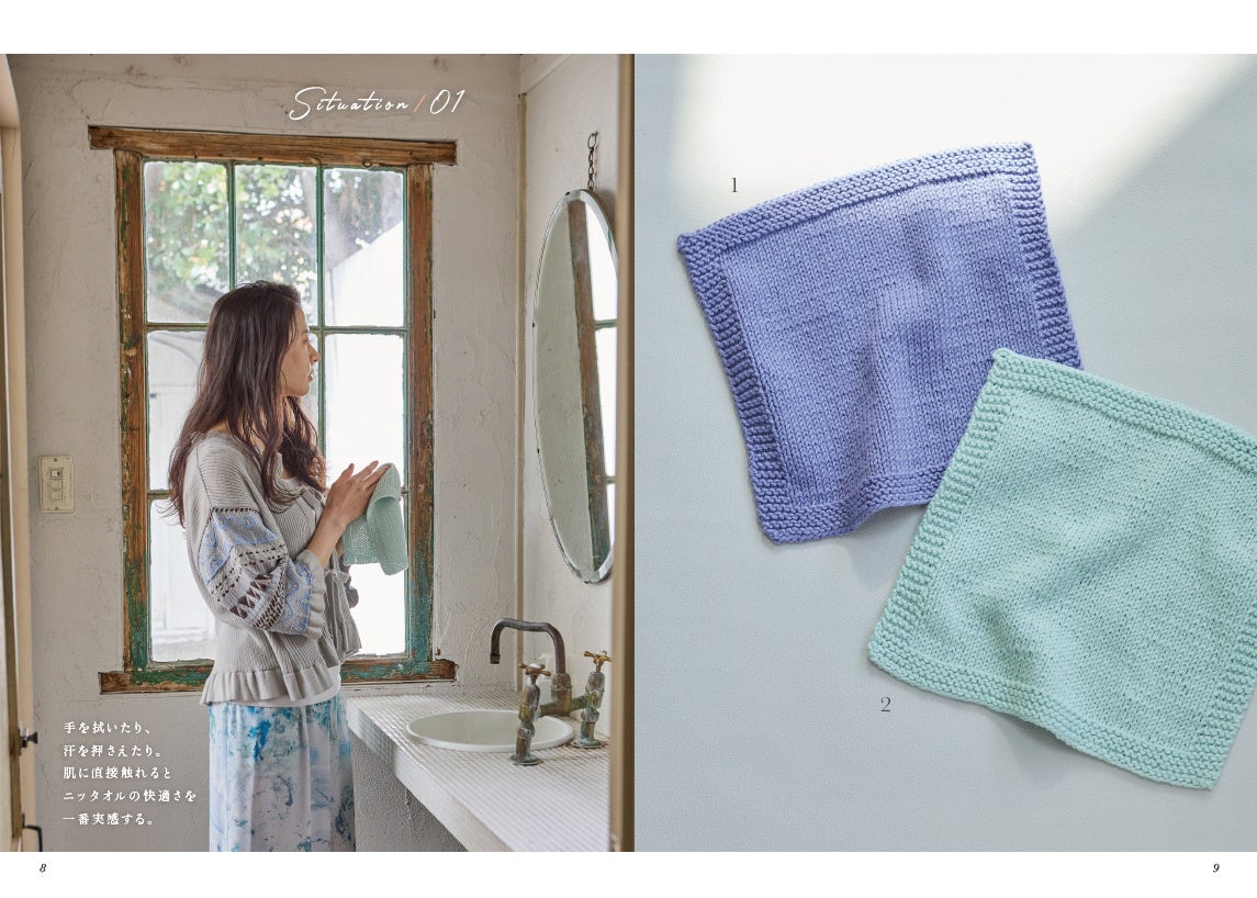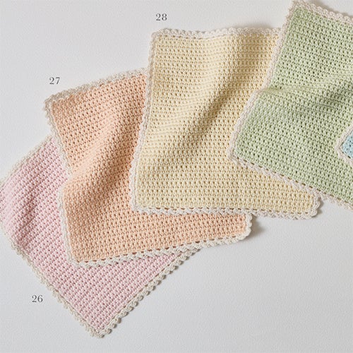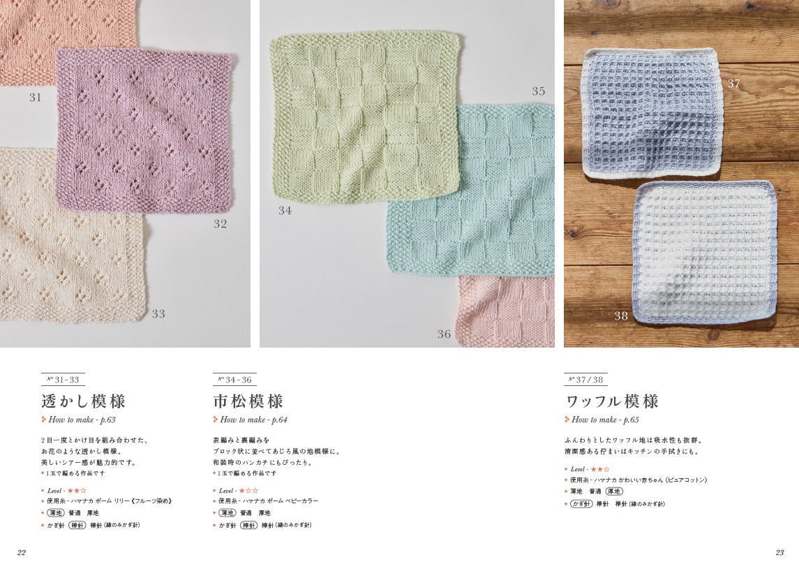 ほとんどの作品が一般的なハンカチサイズの22センチの正方形ですが、好みで縁編みを加えたり、長方形にアレンジしたり、自分だけのニッタオルを楽しんでください.