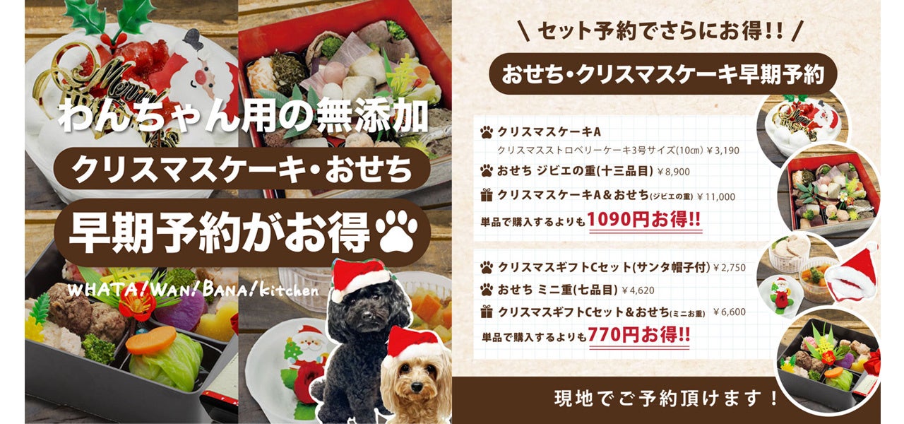 ワンバナキッチンでは、わんちゃん用のクリスマスケーキやおせちを取り扱っています!全て無添加で安心してご利用いただける商品です。特に鹿肉を使用した贅沢なメニューは、わんちゃんたちにとって特別なごちそう。豪華な見た目と美味しさで、クリスマスやお正月を一層楽しく演出します。