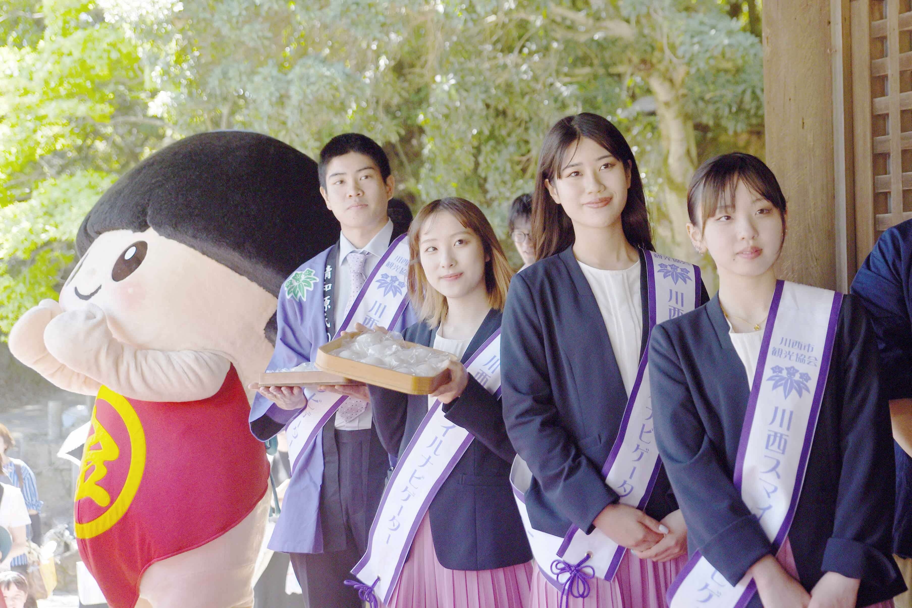 また、恒例となっている「餅まき」では、川西市観光協会の協力で川西スマイルナビゲーターや市公式キャラクターの「きんたくん」らが来場者へ餅をまきました。