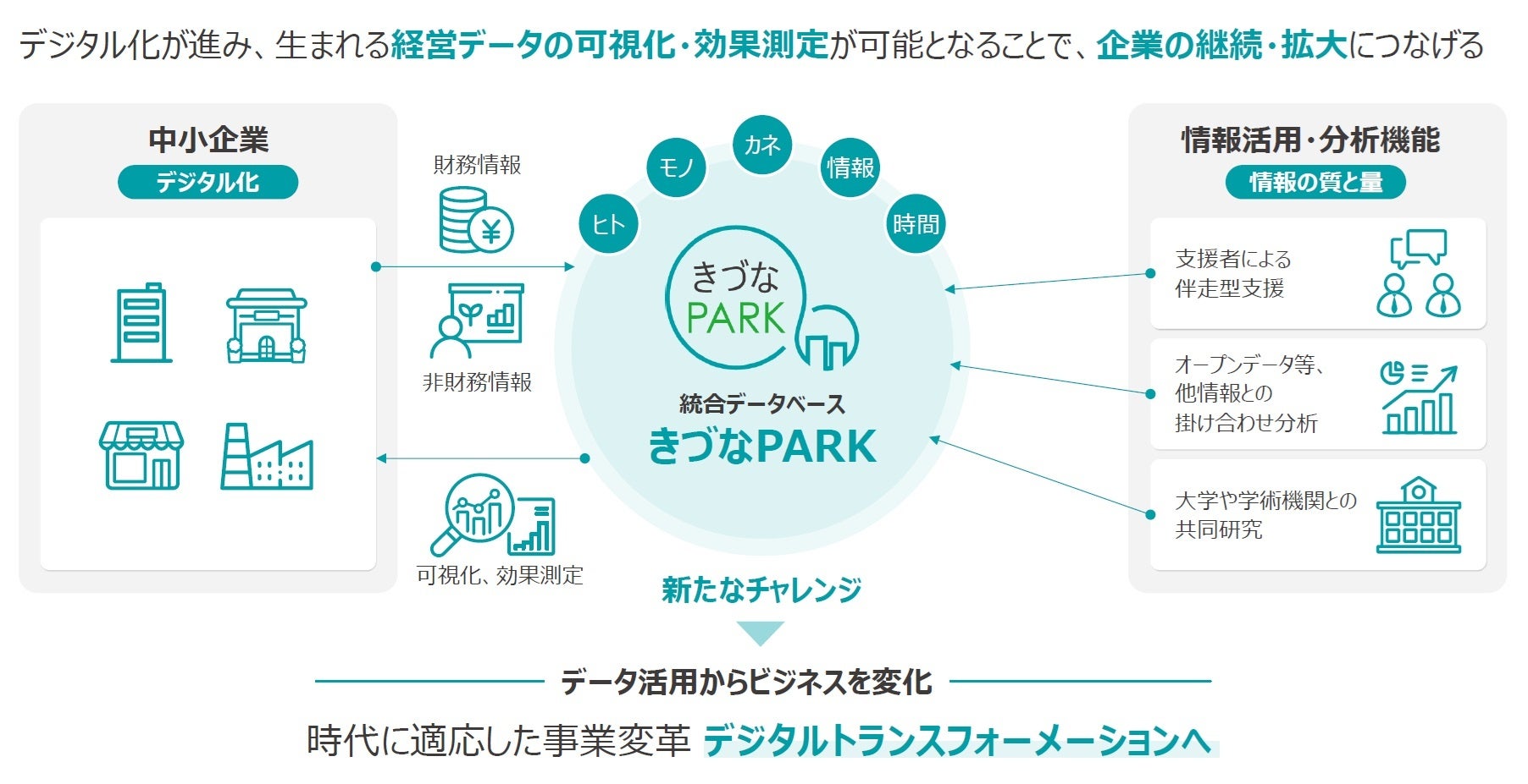 「中小企業はデジタル化の遅延、経営資源の不足に加え、複雑化する経営環境への適応という課題に直面しています。「きづなPARK」は、これらの課題に対し、企業の財務・非財務情報を可視化し、客観的な経営状況の把握と戦略的な意思決定を支援する情報基盤です。本プラットフォームでは、企業のDX推進状況やESG(環境・社会・ガバナンス)に関する評価を通じて、市場における自社のポジションを明確化します。企業が自社の経営データを蓄積することで、経営改善に資する各種レポートを生成し、課題の特定と解決を促進します。さらに、専門家による伴走型サポートおよび企業ドクターによるアドバイザリーサービスを提供し、具体的な改善策の実行を支援します。アンケートや財務データを基に、現状分析から課題設定、目標達成に向けたスコアリング向上まで、包括的なサポートを実施いたします。「きづなPARK」は、中小企業の経営情報を集約し、企業間の連携を促進することで、持続的な成長を支援する次世代型プラットフォームを目指します。