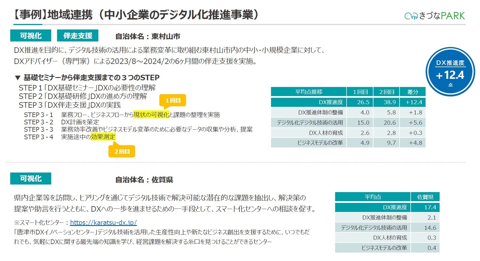 続いて今西より「産」「官」「学」「金」と連帯しながらネットワークに重点を置いた伴走型支援をすることの大切さについて説明しました。その後成功事例の紹介があり、自治体の例として東村山市や佐賀県での成功例の紹介がありました。とくに東村山市では働く女性へのDX支援を通して支援企業のDX推進度が12.4ポイント向上するという成果がありました。