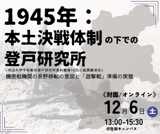 明治大学の生涯学習機関「明治大学リバティアカデミー」は、12月6日(土)に公開講座「1945年:本土決戦体制の下での登戸研究所~秘密戦機関の長野移転の意図と『遊撃戦』準備の実態~」を明治大学生田キャンパスでの対面およびオンラインで開催します。事前予約制で、参加費は無料です。