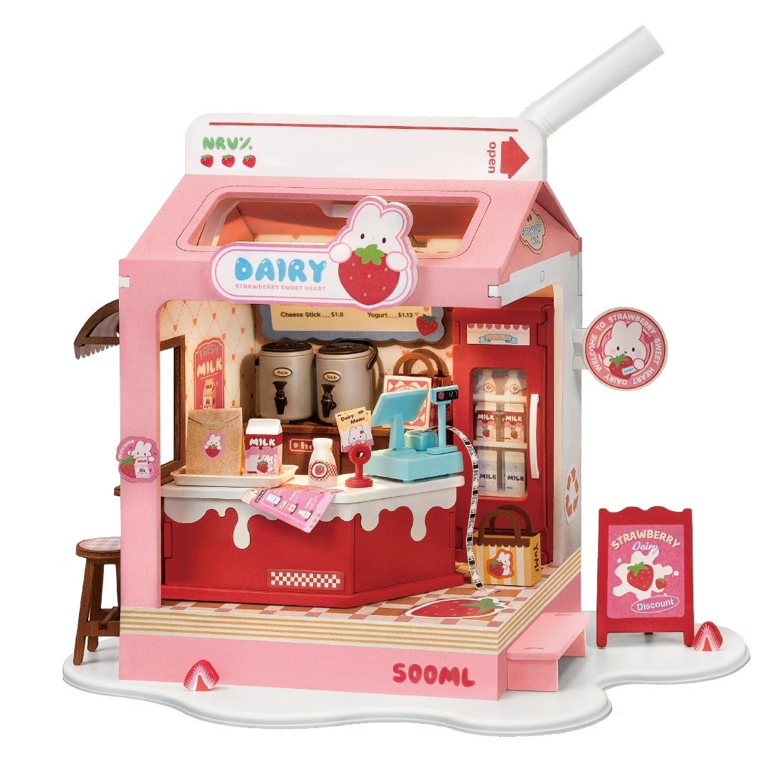 『いちご牛乳ボックス』は、ピンクを基調にしたデザイン、牛乳パックの外観、屋根に刺さったストローがポイント。レジの画面やメニューなど、小さなパーツは細部までつくり込まれており、見ているだけでワクワクするミニチュアハウスです。