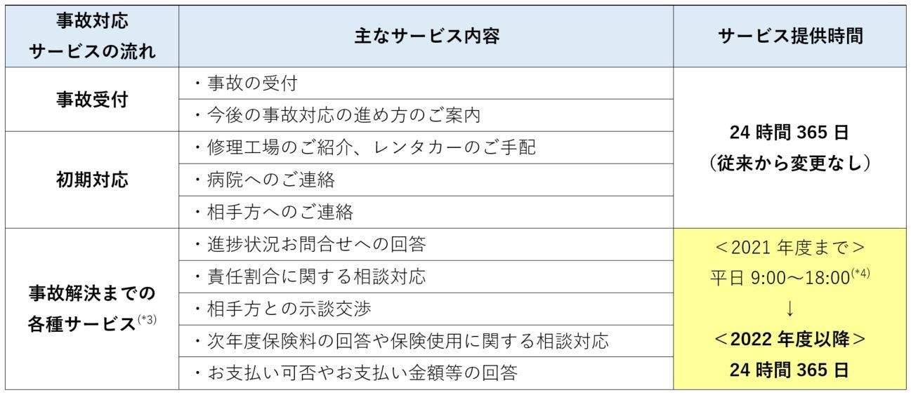 (*2) 当社の事故対応サービスは、1つの事故に1人の専任担当者とサポートチームが担当する「1事故1担当者+チームサポート制」で提供しており、土日・休日・夜間については、専任担当者に代わって、別の経験豊富で専門知識を有するスタッフが事故対応サービスを提供します。