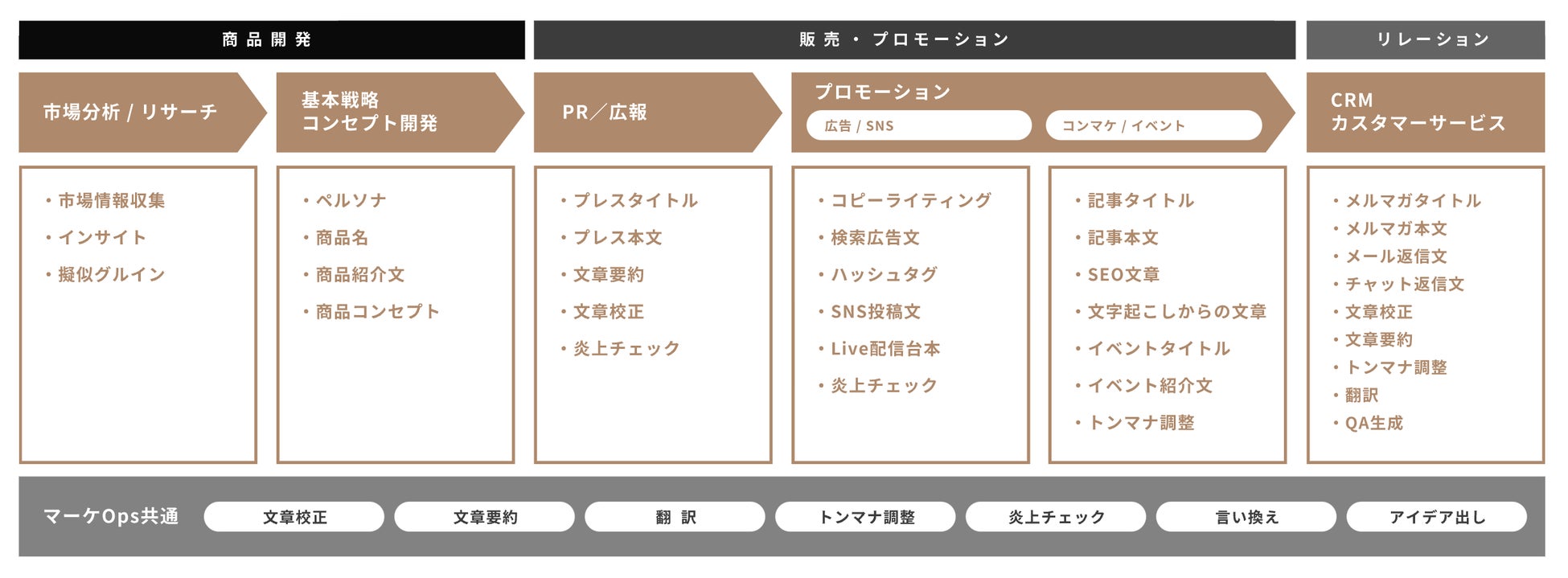 「マーケGAI」は上記以外にも、対象商材・サービスに付随して求められる役割に対応する様々な機能を搭載し、商品開発からPR・プロモーション、カスタマーサービスまで、幅広いマーケティング業務をサポートいたします。