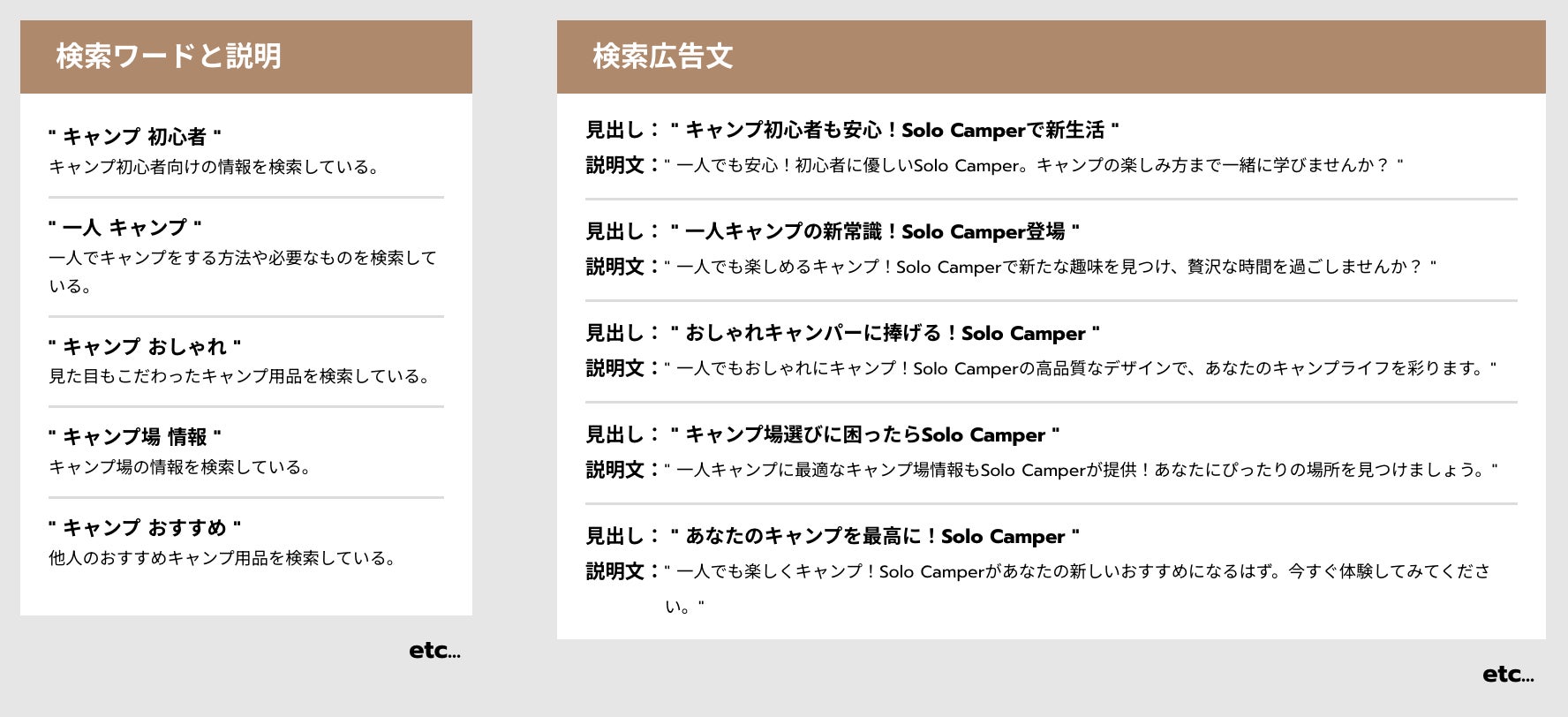 商材情報、ペルソナ属性情報をもとに、検索広告に必要となる見出しと説明文を作成します。