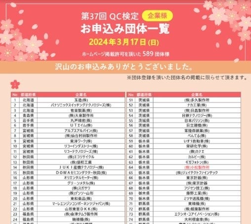どのような組織がQC検定に取り組んでいるのかをご紹介いたします。下記URLに、前回検定(第37回QC検定:2023年3月17日実施)を団体申込で受検された企業・団体・学校のうち、名称公表の承諾をいただいた組織の一覧を掲載しています。ぜひご覧ください。