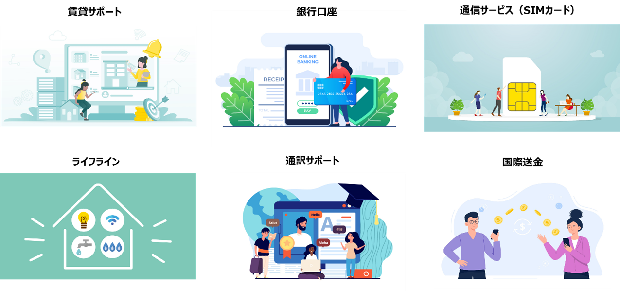 「生活基盤」:銀行口座の開設や通信サービス(SIMカード)の入手、電気・ガス・水道・インターネットの手続きサポート