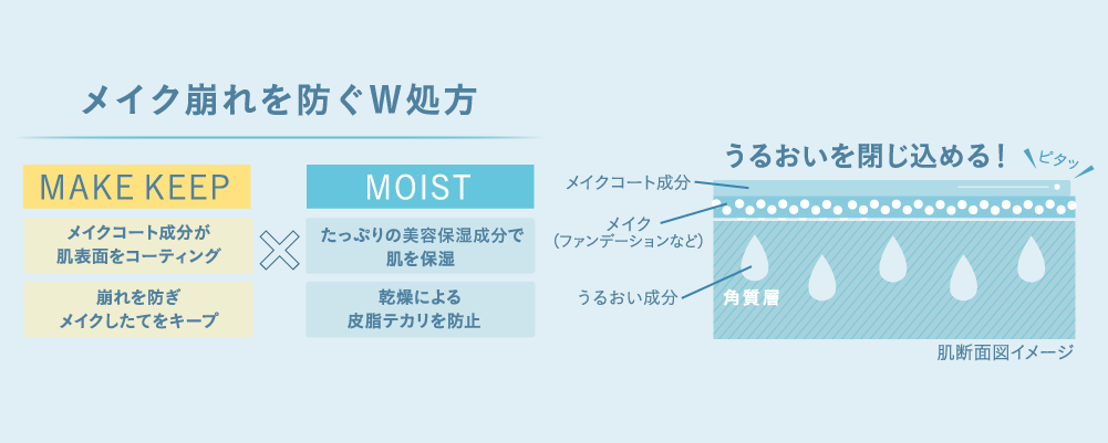 美容保湿成分で肌を保湿し、メイクコート成分でメイクを守るW処方を採用。