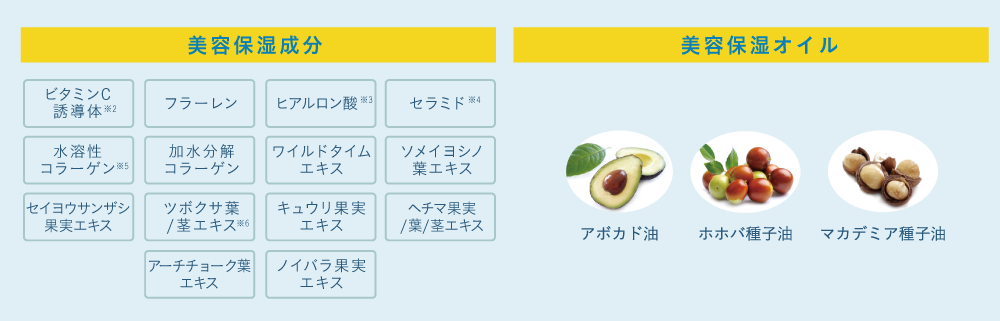 ※1 メイクアップ効果による。 ※2 リン酸アスコルビルMg(保湿成分) ※3 ヒアルロン酸Na ※4 グルコシルセラミド(保湿成分) ※5 水溶性コラーゲン(保湿成分) ※6 ツボクサ葉/茎エキス(肌荒れ防止) ※7 水を含む。 ※8 ナイアシンアミド(整肌成分) ※9 加水分解サケ卵巣膜エキス(保湿成分) ※10 アセチルヒアルロン酸Na(保湿成分)