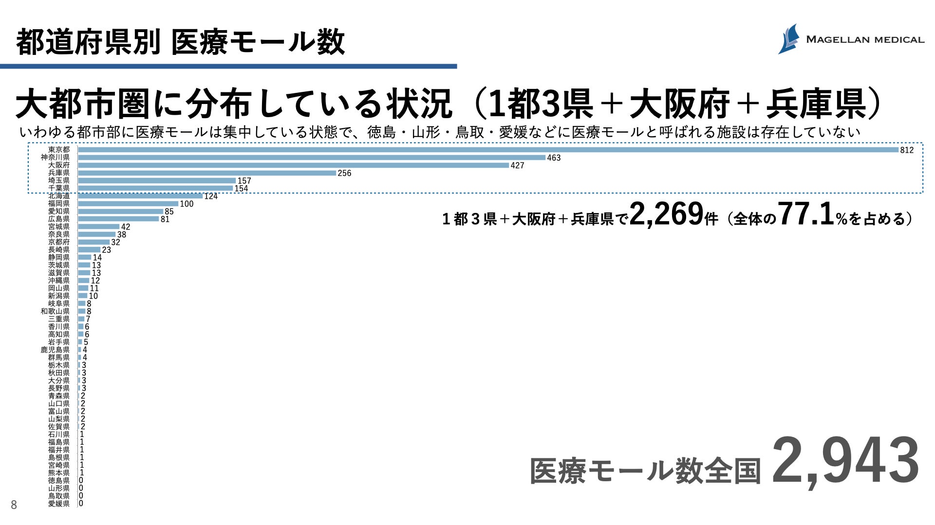 国内の医療モール(※言葉の定義はレポートに記載)数は2,943件、うち全体の77.1%にあたる2,269件が1都3県と大阪府、兵庫県に分布。都市集中構造が明らかになった。