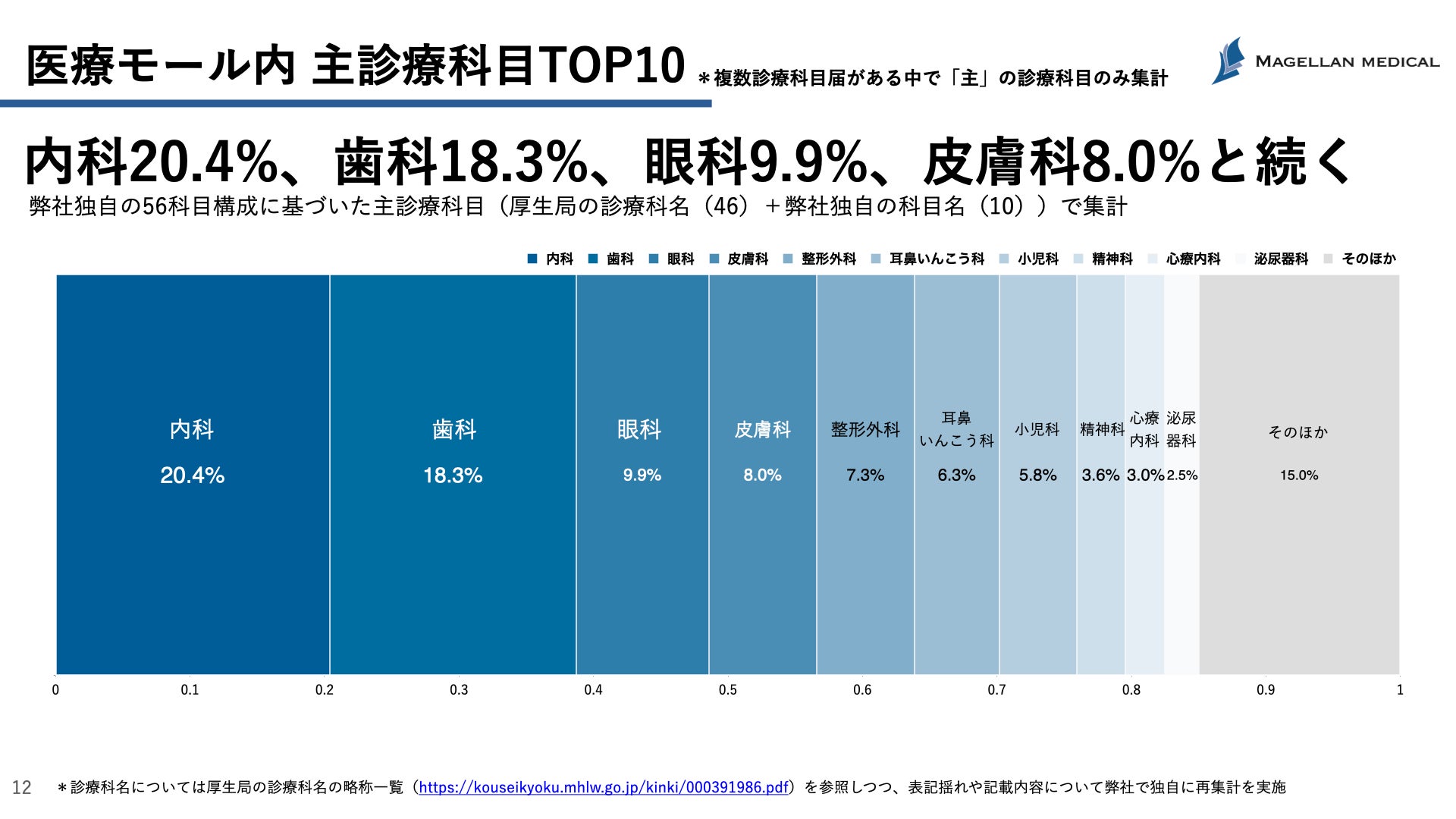 医療モールに入居する主診療科目の割合は、内科が最も多く20.4%、歯科、眼科、皮膚科と続くことが明らかになった。