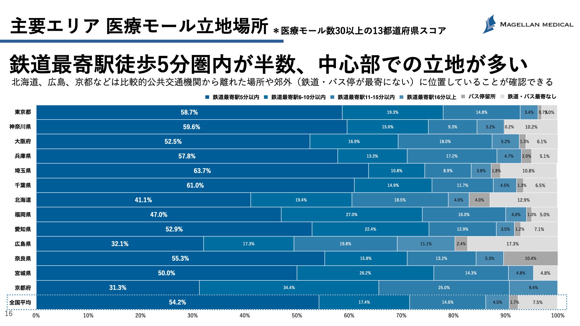 医療モール数30以上の都道府県における、医療モールの立地傾向が明らかになった。半数以上は鉄道最寄駅徒歩5分圏内に位置するが、北海道、広島、京都などでは公共交通機関を利用しにくい場所に位置する医療モールの割合が比較的高まる。