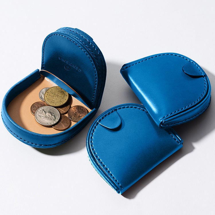 鮮やかな発色に一目惚れする人が続出!究極の“青”を追求した「ブルーコードバン」のミニマム財布。小銭をコンパクトに持ち歩ける馬蹄型は、“現金ちょい持ち派”に最適の逸品です。