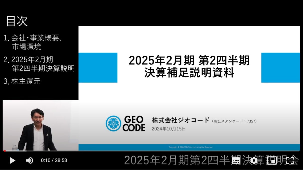 ジオコード、2025年2月期 第2四半期決算説明の動画を公開