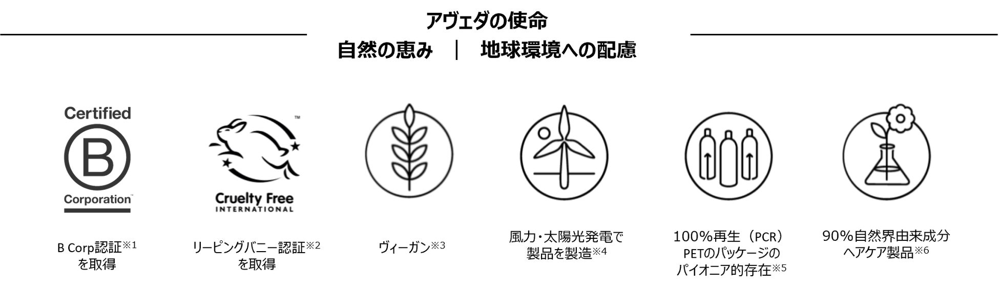 ※1 www.bcorporation.net 米国の非営利団体B Labにより、環境や社会に配慮した公益性の高い企業に付与される国際認証です。※2 リーピングバニー認証とは、クルエルティフリー・インターナショナルによって、製品開発~製造工程で動物実験を行っていないブランドに付与される、国際的に認められている最高水準の認証です。 ※3 動物実験も行わず、動物由来成分も使いません。 ※4 製品の製造には、(米国の)再生可能エネルギークレジットやカーボンオフセットを通じてアヴェダの太陽電池や風力エネルギーによる電力が供給されています。更に、工場施設において、2023年末までに、ULスキームによるごみ廃棄場のシルバーゼロ ウェイスト認証を取得できるよう取り組んでいます。※5 85%以上のスキンケアおよびヘアスタイリングのPETパッケージとジャー容器は再生(PCR)PETを100%使用しています。 またアヴェダは美容業界において、100%再生(PCR)PETパッケージを採用した初めての化粧品会社です。※6 自然界由来成分とはISO16128の自然由来原料の定義に基づいたもので、成分の由来の大半が植物、非石油系ミネラル、または水であることを意味します。また、90%は、アヴェダヘアケア製品のアヴェダが算出したおおよその値です。