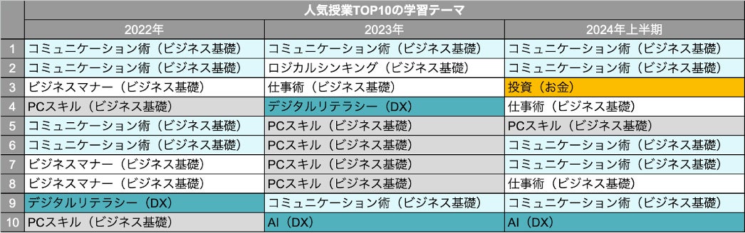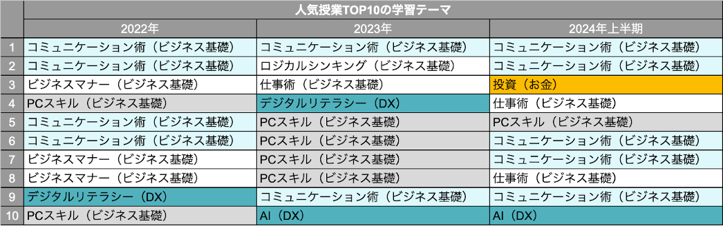 2022年から2024年上半期までの各年の人気授業TOP10を学習テーマで比較すると、2024年上半期は「コミュニケーション術」を扱う授業の人気が、昨年人気上位を占めた「PCスキル」をテーマとした授業に取って代わりました。