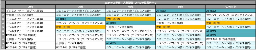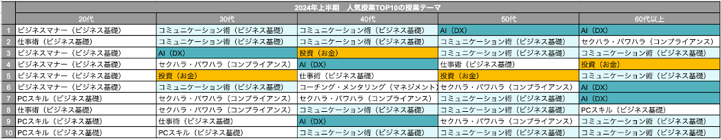 2024年上半期の年代ごとの人気授業TOP10を学習テーマで比較すると、新社会人を含む20代では「ビジネスマナー」や「PCスキル」といった基礎的なビジネススキルを学ぶ授業が人気上位を占める一方、30代以降はどの年代でも「コミュニケーション術」の授業が最も人気でした。