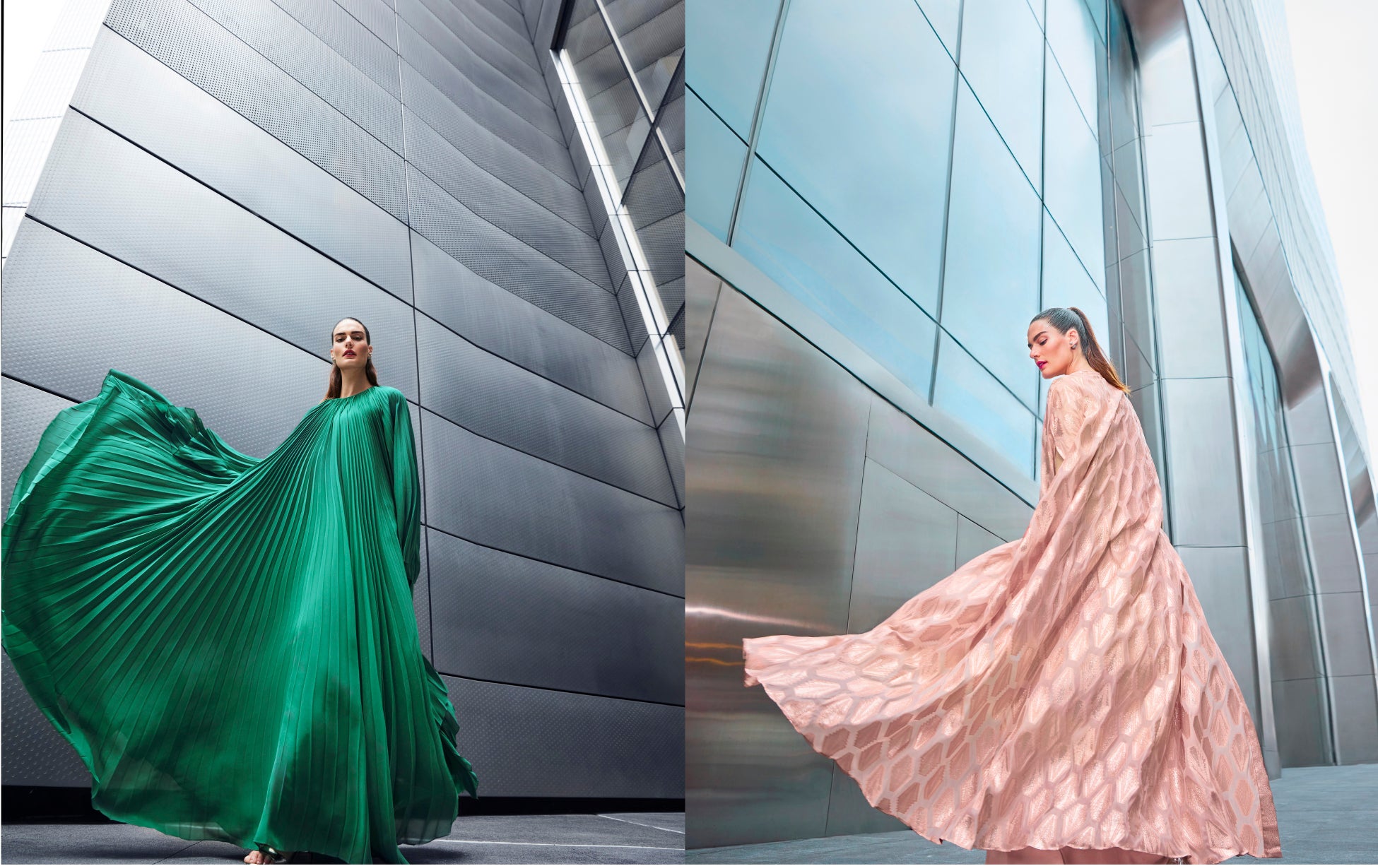 今シーズンのテーマである“爽やかなエレガンス”と“洗練”を反映したカラーパレットのもと、様々なデザインが登場します。リッチなエメラルドグリーンやタイムレスなブラックのカフタンドレスには、特徴的な細いプリーツがあしらわれ、優雅で流れるようなシルエットを描きます。新たに加わったフェミニンなコーラルカラーには、繊細なビーズの装飾が施され、鮮やかでラグジュアリーなアクセントを添えています。