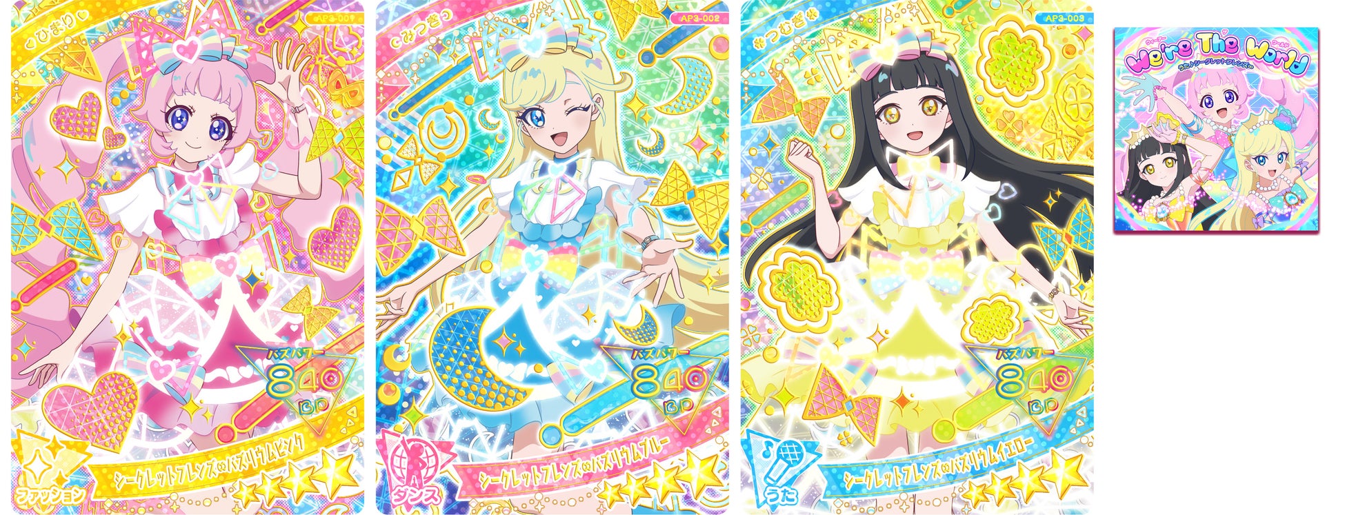 8月1日(木)から稼動する「3だん」では、アニメで主人公「ひまり」「みつき」「つむぎ」が3人チームを結成する展開に合わせて、チームコーデ「シークレットフレンズ∞バズリウム」のカードが登場し、 3人でのライブが楽しめるようになります。3人ライブは、 「2だん」で搭載された「デュオライブ」と同様、対応しているカードを1枚目に読み込むことで遊ぶことができます。アニメでも流れている3人チームの楽曲「We’re The World」がプレイ楽曲に設定され、2人目、3人目は好きなキャラクターのカードを読み込ませることもできます。
