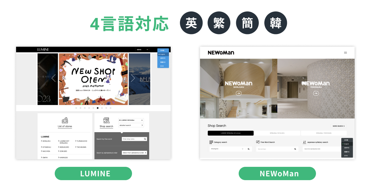ルミネ・ニュウマン の施設サイトおよび施設案内タブレットを、英語、繁体字、簡体字、韓国語に展開しています。