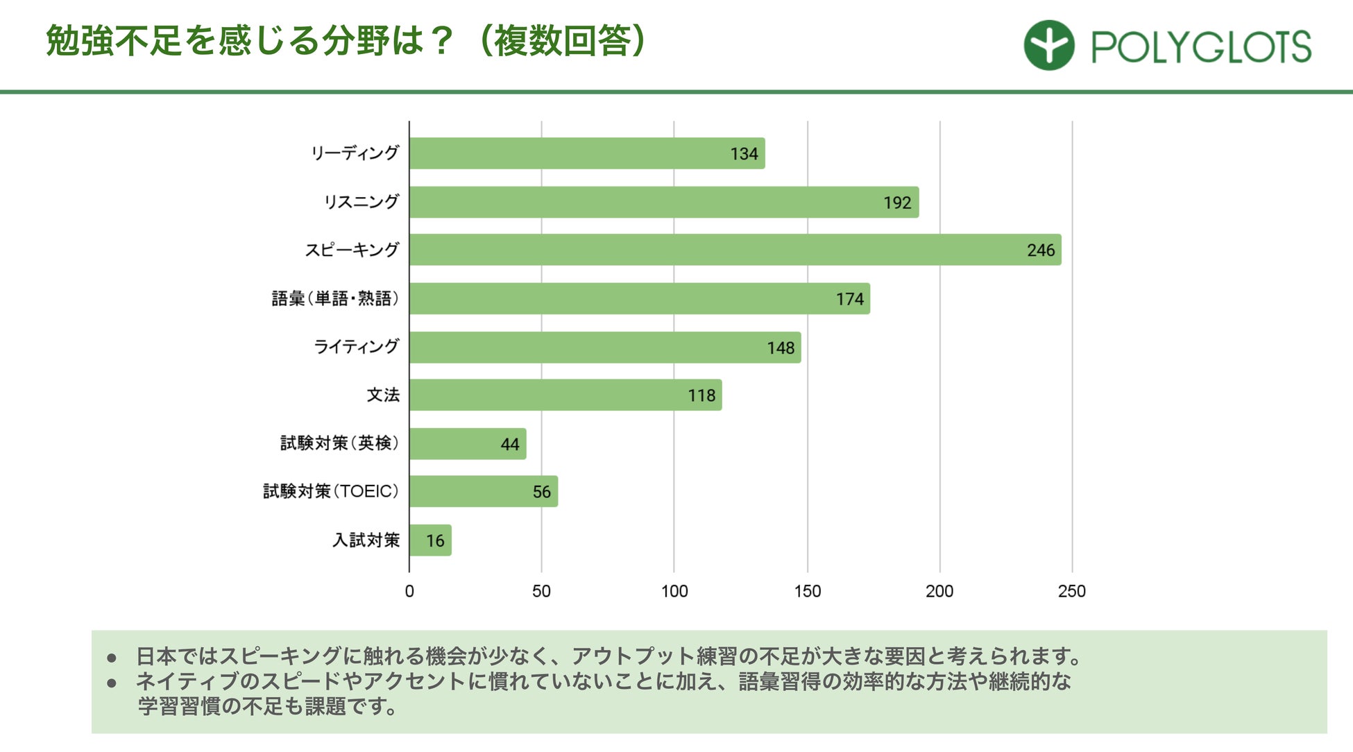 ・約76%の学習者がスピーキングの分野で勉強不足を感じており、話す機会の少なさや