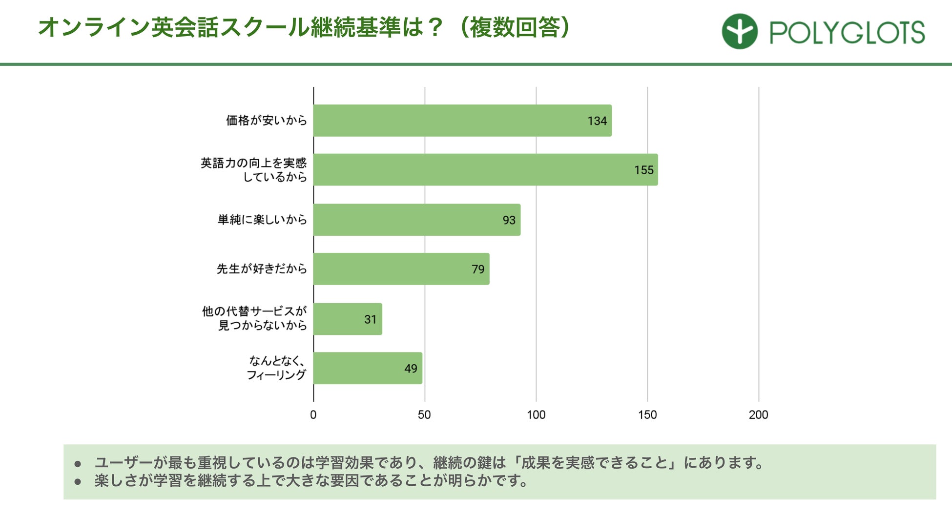継続の理由としては「英語力の向上を実感できること」(48%)が大きな決め手となっている