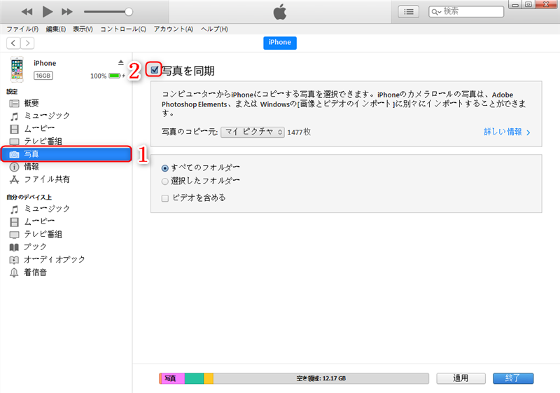 3.iTunesを開きます。左上にあるデバイスマークから自分の端末をクリックし、「写真」を選択して、「写真を同期」をクリックします。