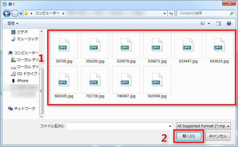 4.SDカードのフォルダを開き、iPhoneに転送したい写真を選択して、「開く」をクリックします。