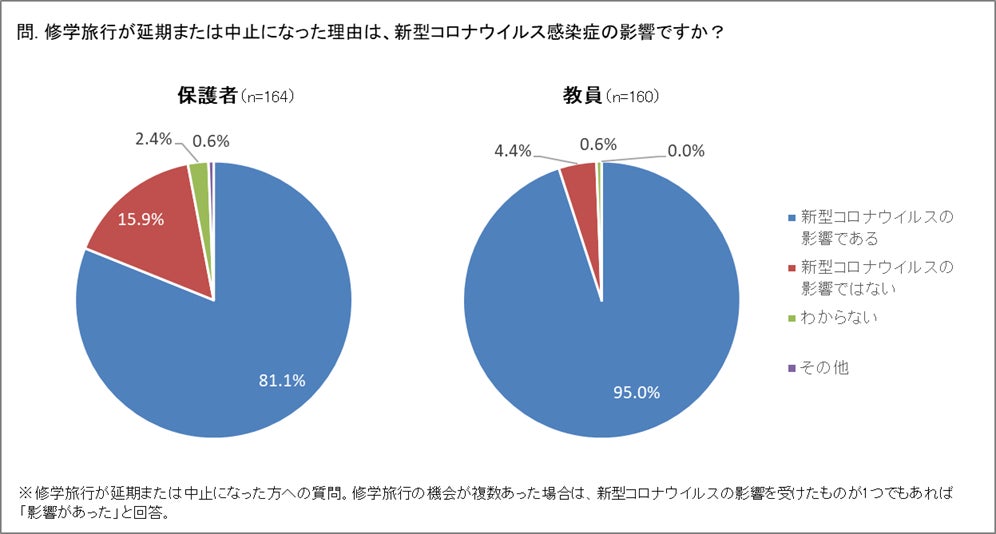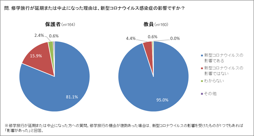 修学旅行が延期または中止になった理由の8割以上が新型コロナ関連。