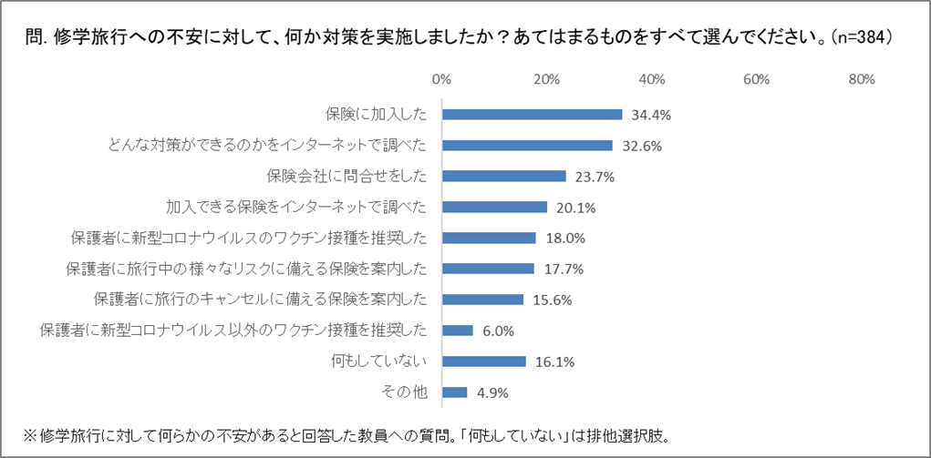 (3)修学旅行への不安に関して何らかの対策をした割合も、保護者より教員の方が大きく、保護者が約51%に対し教員は約79%。もっとも多い行動は、保護者が「どんな対策ができるのかをインターネットで調べた(28%)」で、教員が「保険に加入した(約34%)」。