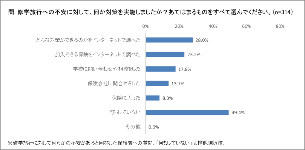 修学旅行への不安に関して何らかの対策をした割合も、保護者より教員の方が大きく、保護者が約51%に対し教員は約79%。もっとも多い行動は、保護者が「どんな対策ができるのかをインターネットで調べた(28%)」で、教員が「保険に加入した(約34%)」。