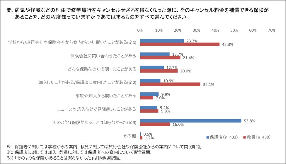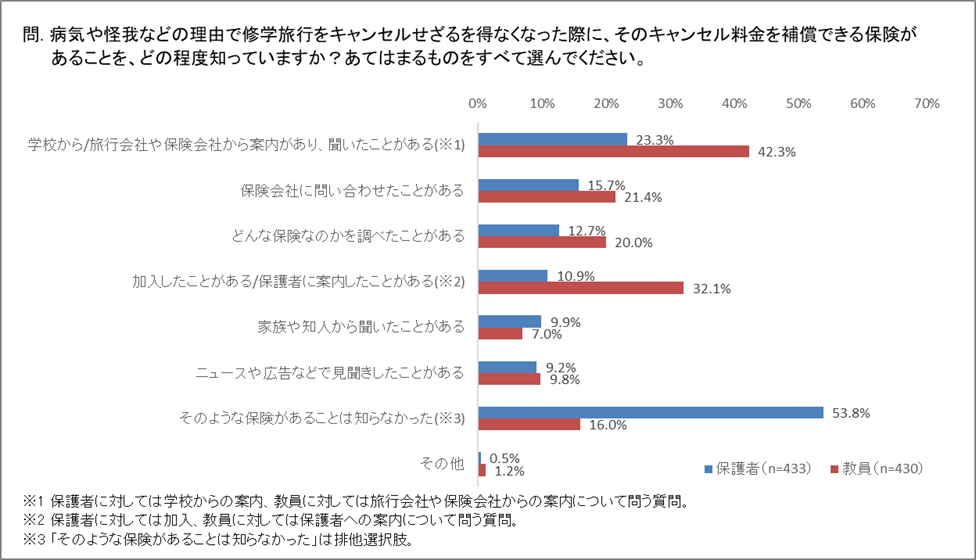 ・修学旅行のキャンセル料を補償できる保険の認知度
