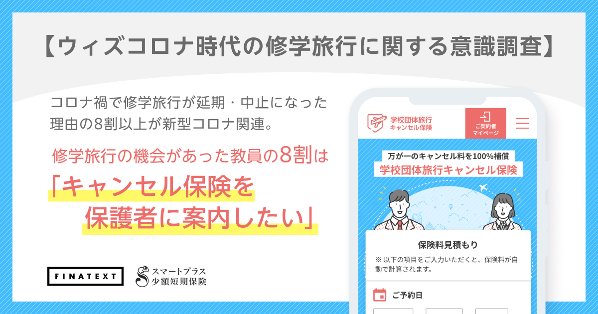 FinatextとスマートプラスSSIは、保護者が任意で加入でき、新型コロナなどのやむを得ない理由で生徒が旅行に参加できなくなった場合のキャンセル料を100%補償する「学校団体旅行キャンセル保険」を提供していることから、コロナ禍における修学旅行の実態とウィズコロナ時代における保護者や教員のニーズを探るために今回の意識調査を実施しました。